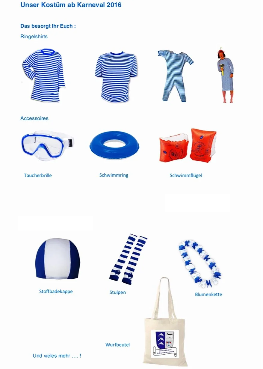 Unsere Tradition zum Kostüm hat sich nicht geändert. Wie die letzten Jahre werden wir wieder Blau & Weiß kostümiert sein. Dazu werden wir alle blau weiße Ringelshirts anhaben, ob kurz, ob lang oder als Kleid ist euch überlassen, deshalb besorgt Ihr euch bitte jeder eins nach Eurem Geschmack.